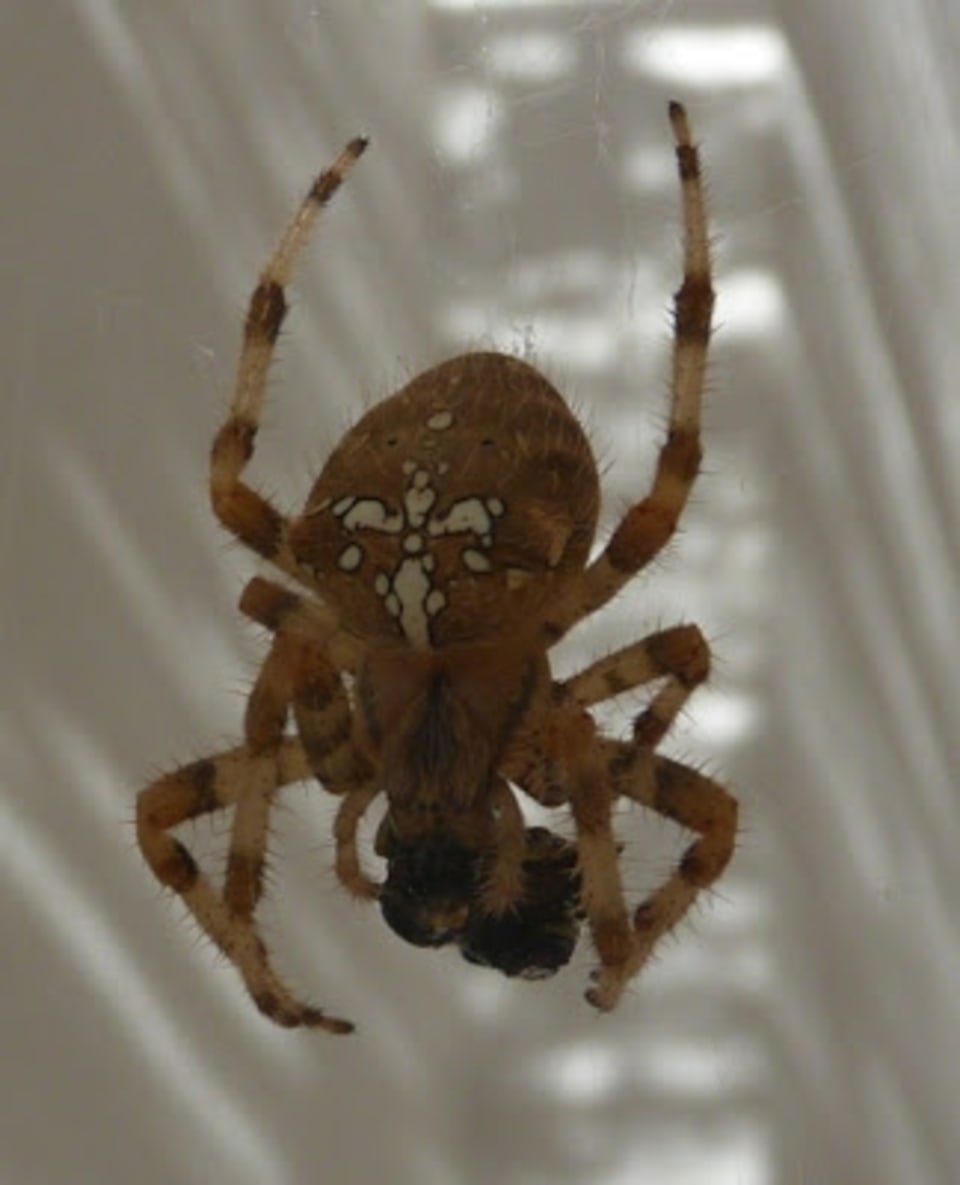 I found this spider hanging out at a friends house above Lanjaron, its been identified as :- English - Cross Spider Spanish - Araña de la Cruz Latin - Araneus diadematus. This species of spider is "Spider of the year 2010" and is being studied by the Iberian Aracnologic Group who are collecting data and detailed pictures. If you have any data or photos on this species please either contact the group or me with the details. This type of spider often move home at night eating it's web and any insects that have been caught during the day.